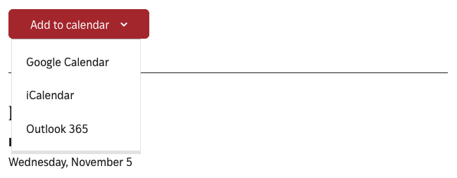 When you visit the page of an individual event, an Add to calendar dropdown will appear near the bottom of the description. Clicking on it will reveal three ways you can add the event to your calendar: Google Calendar, iCalendar, and Outlook 365.