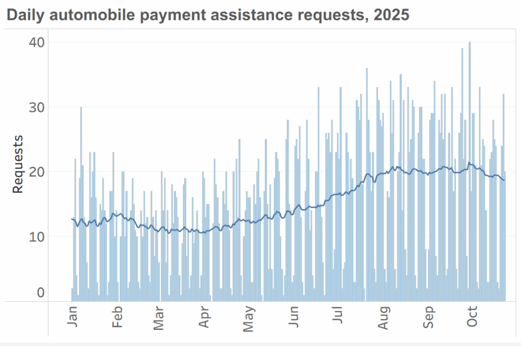 The 211 call data also revealed another worrisome trend: an increasing number of calls for assistance in making car payments. Unlike food aid requests, calls for help with car payments haven’t spiked recently; instead, they have been going up slowly but steadily since the spring and have now reached about double the baseline level of the past two years. This pattern suggests growing economic uncertainty nationwide. People may be looking for financial assistance in other areas so they can free up money for more critical necessities such as food and housing.