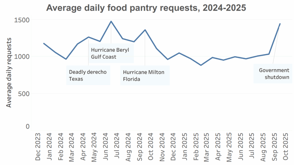 The number of calls for referrals to food pantries already has matched or surpassed the peaks of the past two years, all of which occurred in the aftermath of natural disasters: Hurricane Beryl on the Gulf Coast, Hurricane Milton in Florida, and a deadly derecho in Texas.